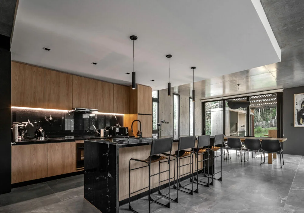 La planta baja se despliega horizontalmente, aprovechando las mejores orientaciones y vistas que ofrece la ubicación privilegiada de la vivienda. Un espacio integrado entre la cocina, el comedor y el estar principal, en doble altura, se convierte en el verdadero “corazón” de la vivienda. Este diseño permite una conexión continua entre los interiores y el entorno exterior, haciendo que la vivienda se abra al paisaje de Cariló.