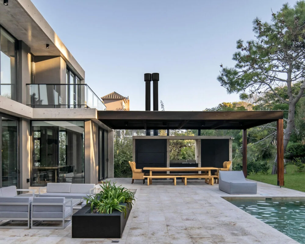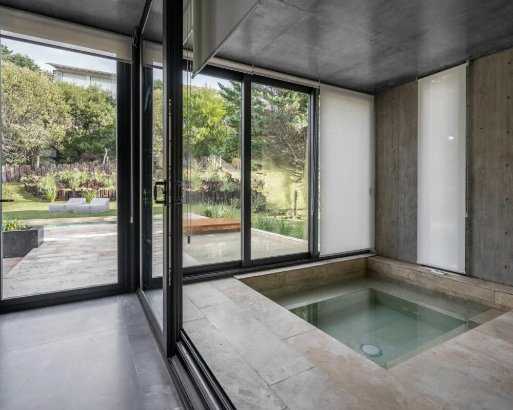 El jacuzzi, con su diseño espacioso, se conecta directamente con el exterior a través de un playón que abraza toda la vivienda. Este espacio está pensado para disfrutar tanto de momentos de intimidad como de encuentros sociales, asegurando la flexibilidad y el confort en todo momento. El diseño paisajístico, a cargo de Nancy Gargiulo, juega un papel clave en la integración de los espacios exteriores con la arquitectura, creando un entorno natural que complementa y realza la experiencia de habitar.