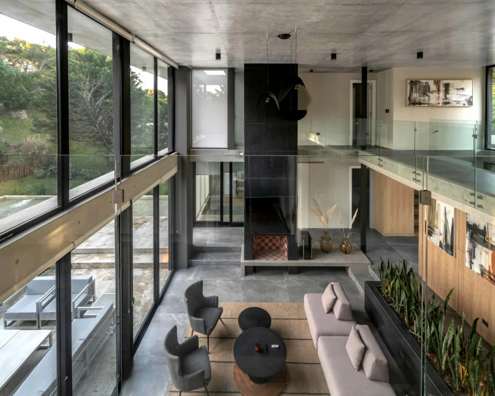 En el interior de Avutarda, el hormigón visto continúa siendo el material dominante, aportando una sensación de solidez y modernidad. Sin embargo, este material se combina cuidadosamente con detalles de madera y acentos en negro en los mobiliarios, logrando una atmósfera cálida y acogedora que contrasta con la robustez del hormigón. En la planta alta, un puente arquitectónico conecta los dos dormitorios ubicados a la izquierda con el dormitorio principal a la derecha, todos ellos equipados con balcones privados y baños en suite, lo que permite disfrutar de vistas panorámicas ininterrumpidas gracias a los grandes ventanales de piso a techo.