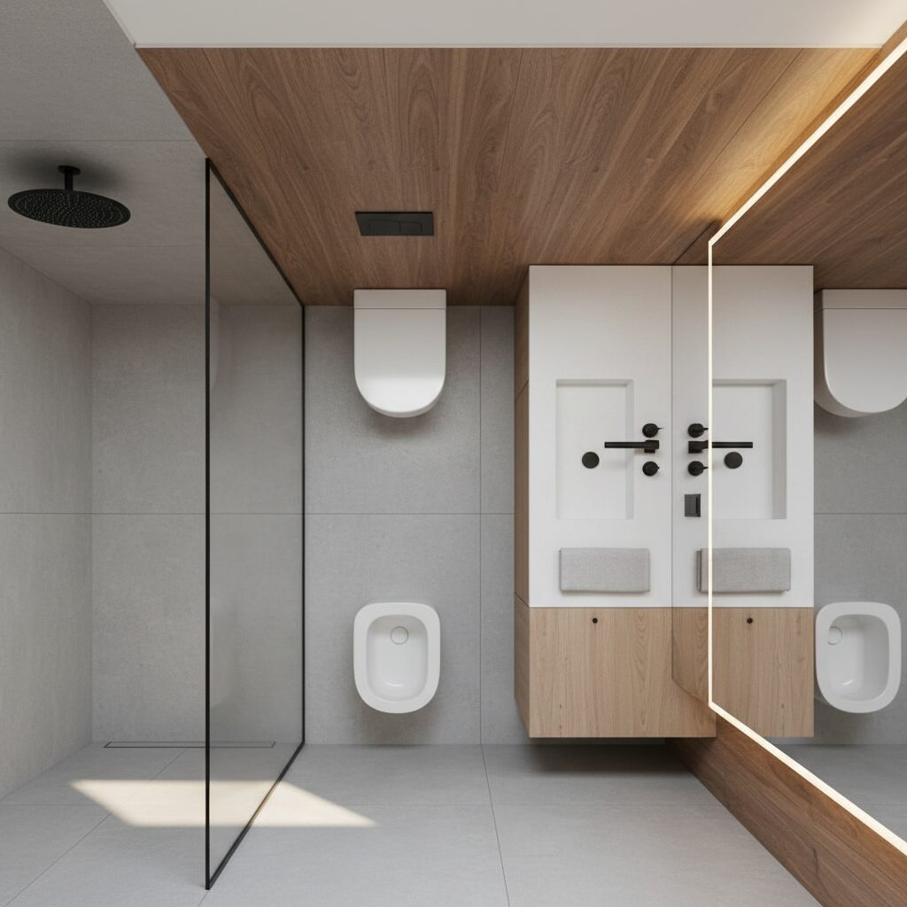 **Superficies: la textura como protagonista:** Adiós a las paredes y pisos planos. Los porcelanatos de gran formato, que emulan hormigón, piedra natural o maderas exóticas, son la base. Sin embargo, el microcemento continúa su ascenso imparable por su capacidad de crear espacios continuos y envolventes, ideal para duchas y revestimientos integrados. Lo inesperado es la revalorización de las texturas táctiles: superficies rugosas, con relieves sutiles, que invitan al contacto. La paleta de colores se ancla en neutros cálidos y grises, pero incorpora toques audaces de verdes botánicos o azules profundos, utilizados estratégicamente para crear atmósferas envolventes. Para los arquitectos y constructores, dominar la aplicación de estos materiales y entender sus particularidades es clave para ofrecer soluciones que no solo sean bellas, sino también perdurables y de bajo mantenimiento, pilares fundamentales en la propuesta de valor del sector.