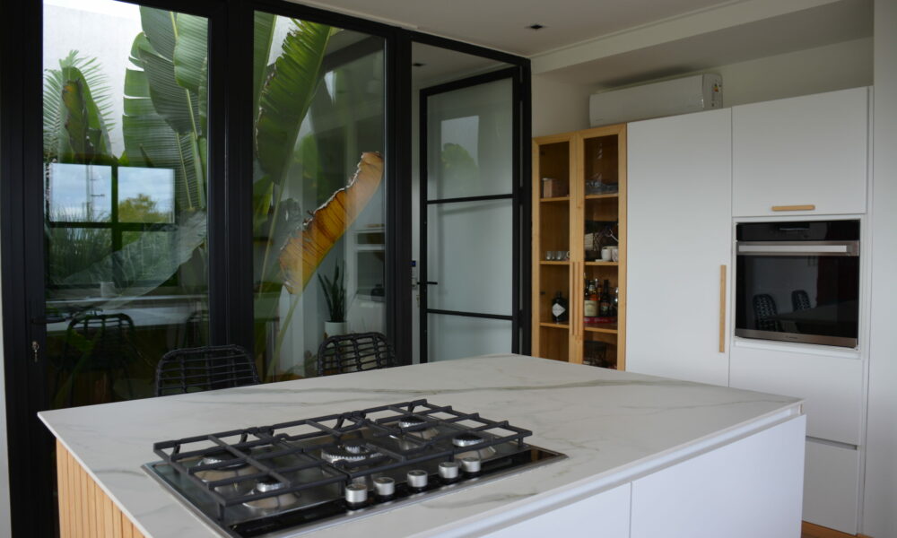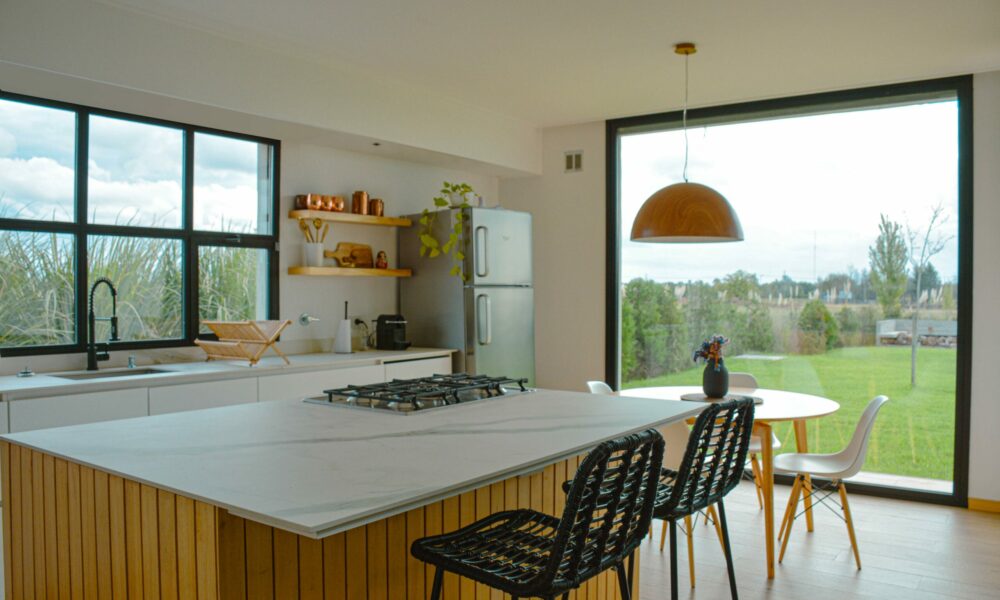 El sector de servicios se resuelve con un acceso secundario que articula despensa, lavadero y cocina. Esta última incorpora una isla central y mobiliario de líneas minimalistas, acompañado por grandes superficies vidriadas que prolongan la visual hacia el jardín.
