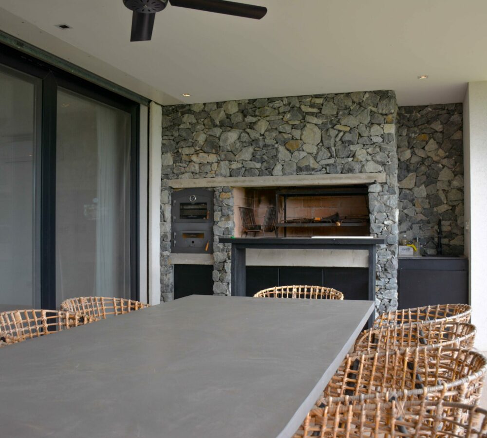 La relación con el exterior culmina en una gran galería semicubierta con parrilla, que funciona como expansión del estar y el comedor. Hacia el jardín, la piscina de 3,5 x 10 metros y un fogonero conforman un sector de esparcimiento que articula arquitectura y paisaje en un recorrido continuo.