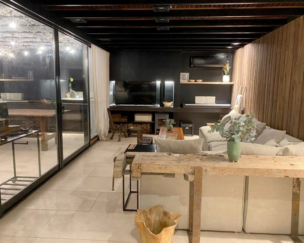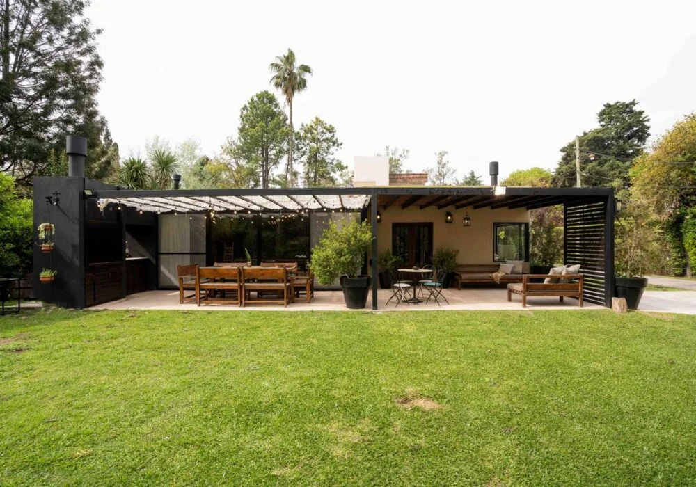 En el exterior, el revestimiento texturado, marcos negros y un hall semicubierto dialogan con el diseño interior. El parque, con tilos, robles, olivos y pinos, ofrece sombra y carácter, mientras el césped de grama bahiana unifica el paisaje. Diferentes sectores de descanso y expansión complementan un proyecto pensado para disfrutar del entorno en equilibrio con el diseño arquitectónico.