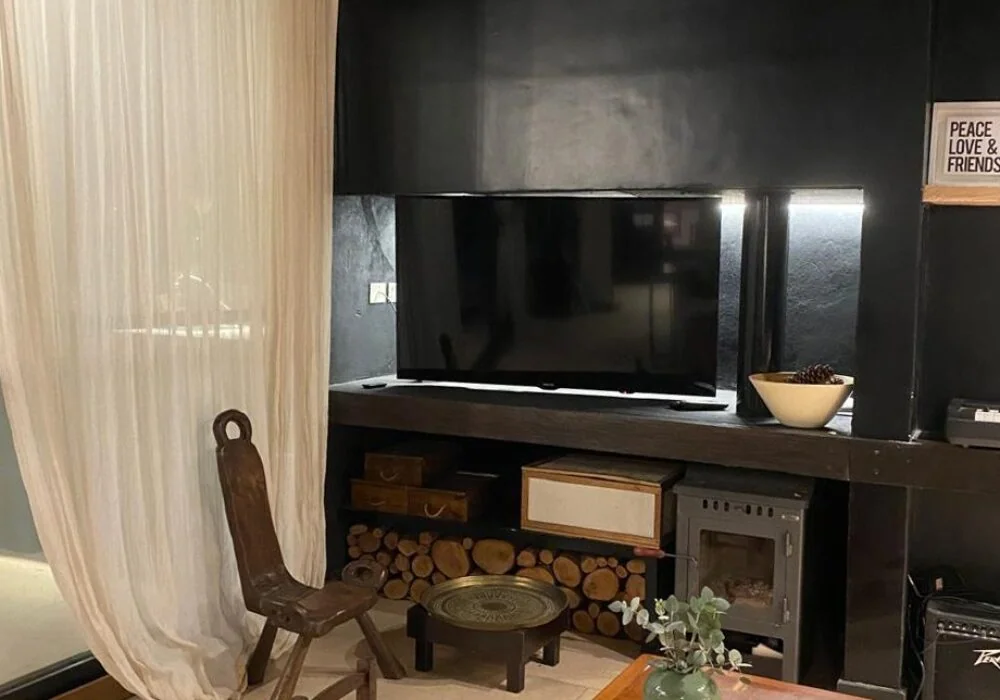 El diseño combina madera y hormigón visto para equilibrar calidez y modernidad. Elementos distintivos, como una mesa de carpintero heredada y decoraciones realizadas con un árbol del jardín, añaden significado al proyecto. Una paleta de tonos neutros — beige, madera y negro — refuerza la sobriedad y armonía visual.