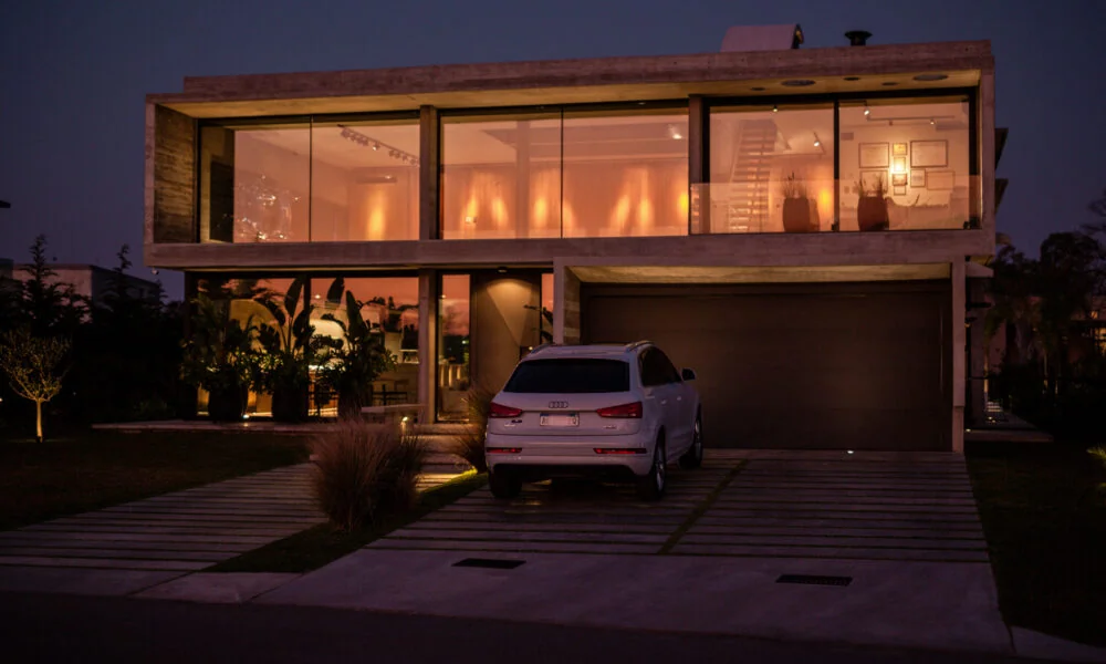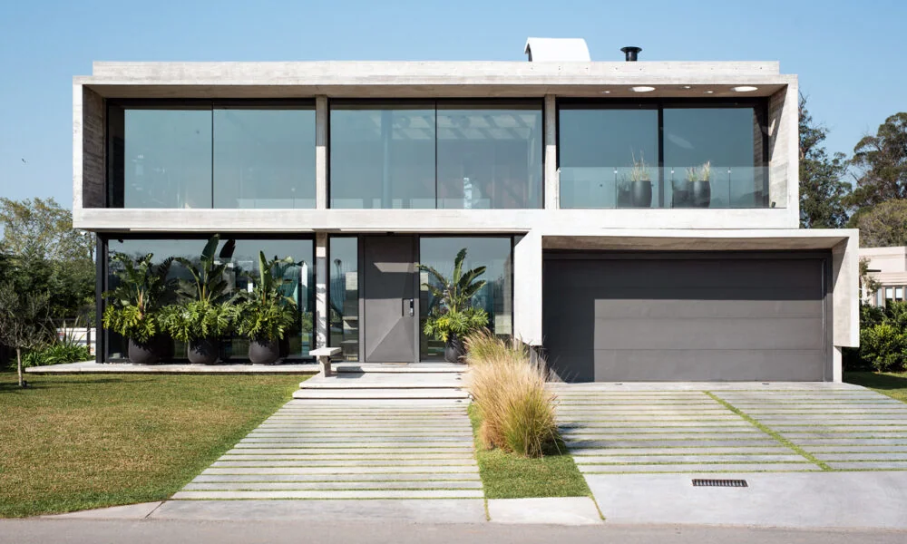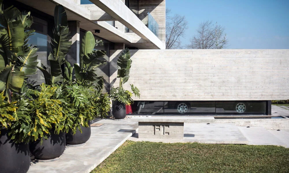 Uno de los requerimientos clave fue la integración de un garaje funcional que, además de albergar dos vehículos, sirviera como taller para el propietario, un ingeniero mecánico. El diseño del volumen frontal destaca por un tabique flotante que permite observar los neumáticos de los autos al ingresar a la vivienda, enmarcado por un espejo de agua que ofrece una serie de reflejos dinámicos.