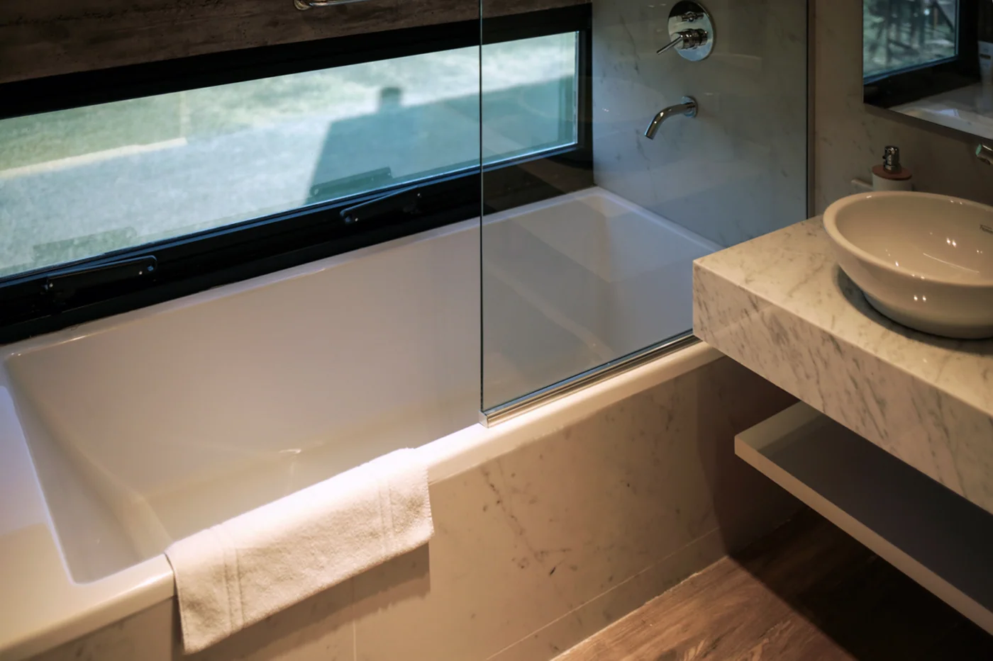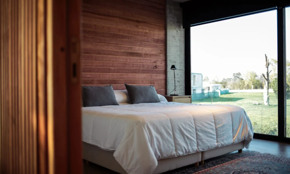 La casa también incorpora elementos distintivos como una cubierta de vidrio de 5×5 metros en la doble altura del estar, que ilumina el tabique de hormigón que sostiene la escalera principal, y una azotea accesible que ofrece vistas impresionantes de la laguna y las copas de los árboles, inspirada en los conceptos de Le Corbusier sobre la “quinta fachada”.