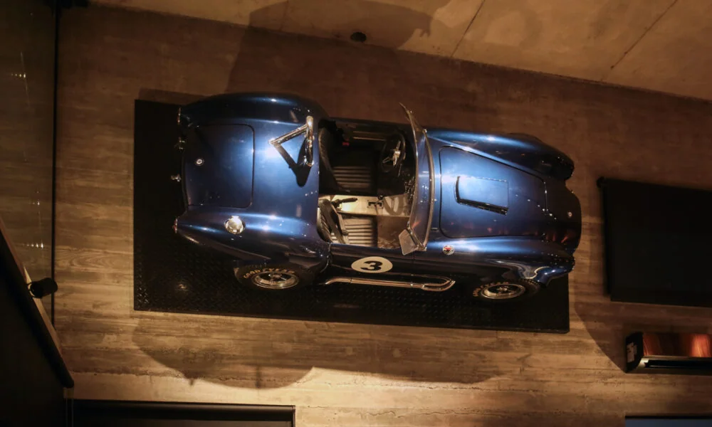 Una particularidad notable de esta residencia es la incorporación de un auto colgado en uno de los muros de hormigón, una réplica a escala 2/3 de un Shelby Cobra, fabricado íntegramente por el propietario. Esta pieza, que pesa unos 500 kg, actúa como una escultura, apreciable desde diferentes ángulos dentro de la casa.