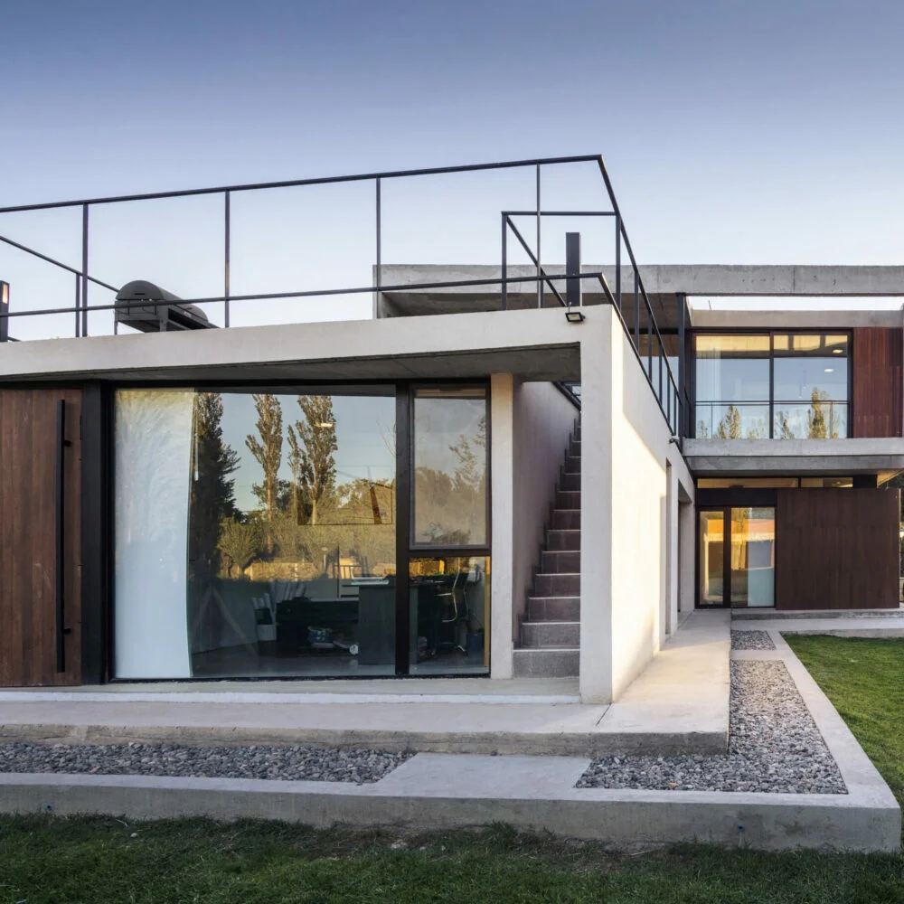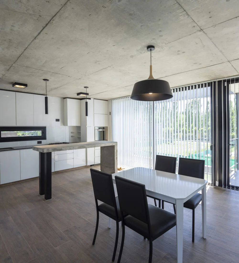 El hormigón armado es el gran protagonista, presente tanto en las losas como en las vigas invertidas que generan continuidad y fluidez en los ambientes. Este material noble, con su textura cruda y carácter robusto, aporta elegancia y durabilidad al proyecto.