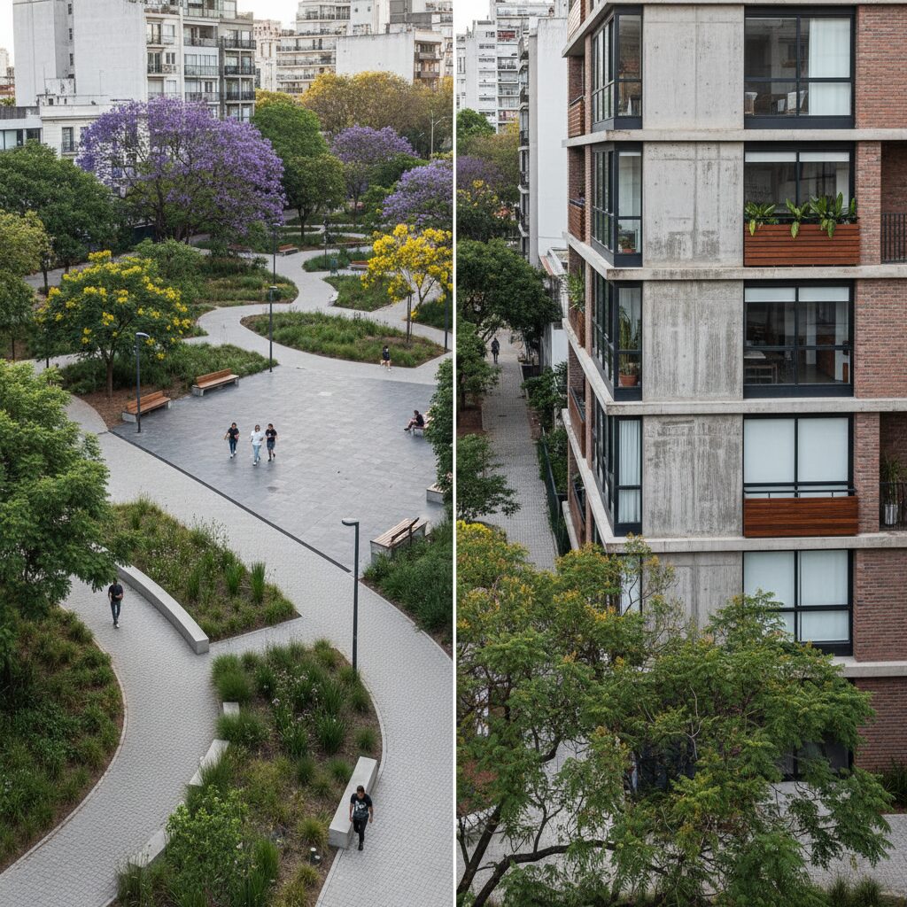 En paralelo, la **infraestructura verde avanzada** deja de ser una opción para convertirse en el fundamento estructural. Proyectos en Santiago de Chile o Medellín ya experimentan con Sistemas Urbanos de Drenaje Sostenible (SUDS) integrados en el diseño paisajístico para la gestión pluvial, reduciendo la escorrentía y recargando acuíferos. Se observa una tendencia hacia la reintroducción de flora nativa para potenciar la biodiversidad, crear corredores biológicos y mejorar la calidad del aire y la regulación térmica urbana. Este enfoque, aunque ambicioso en su ejecución inicial, promete retornos significativos en resiliencia climática y reducción de costos de mantenimiento a medio y largo plazo.