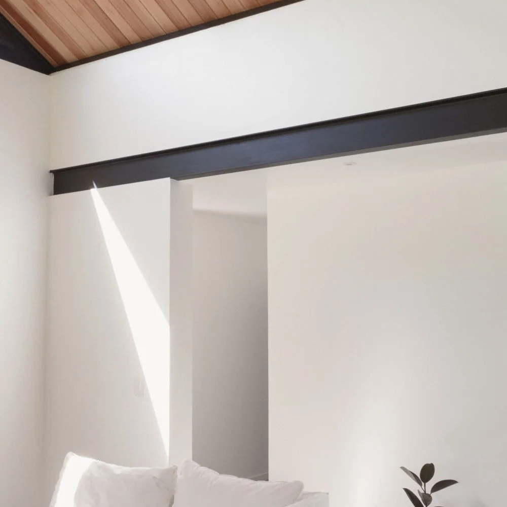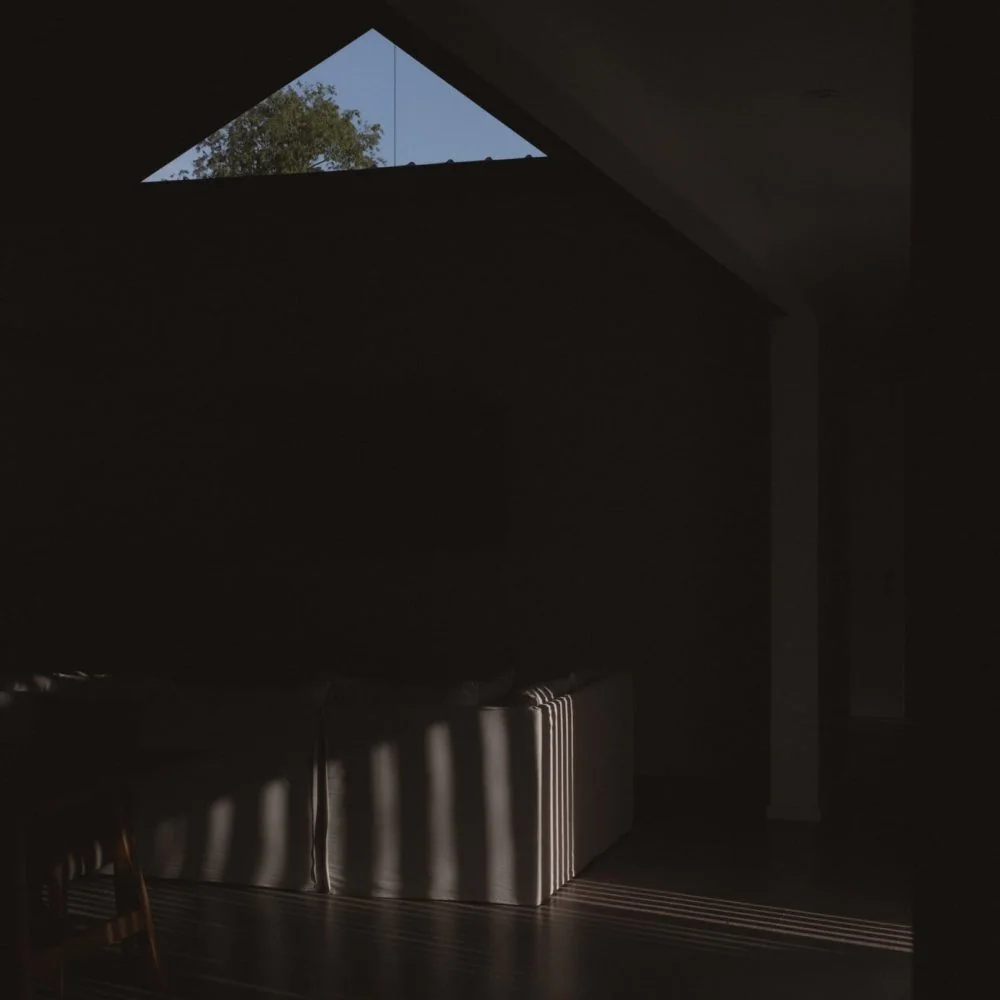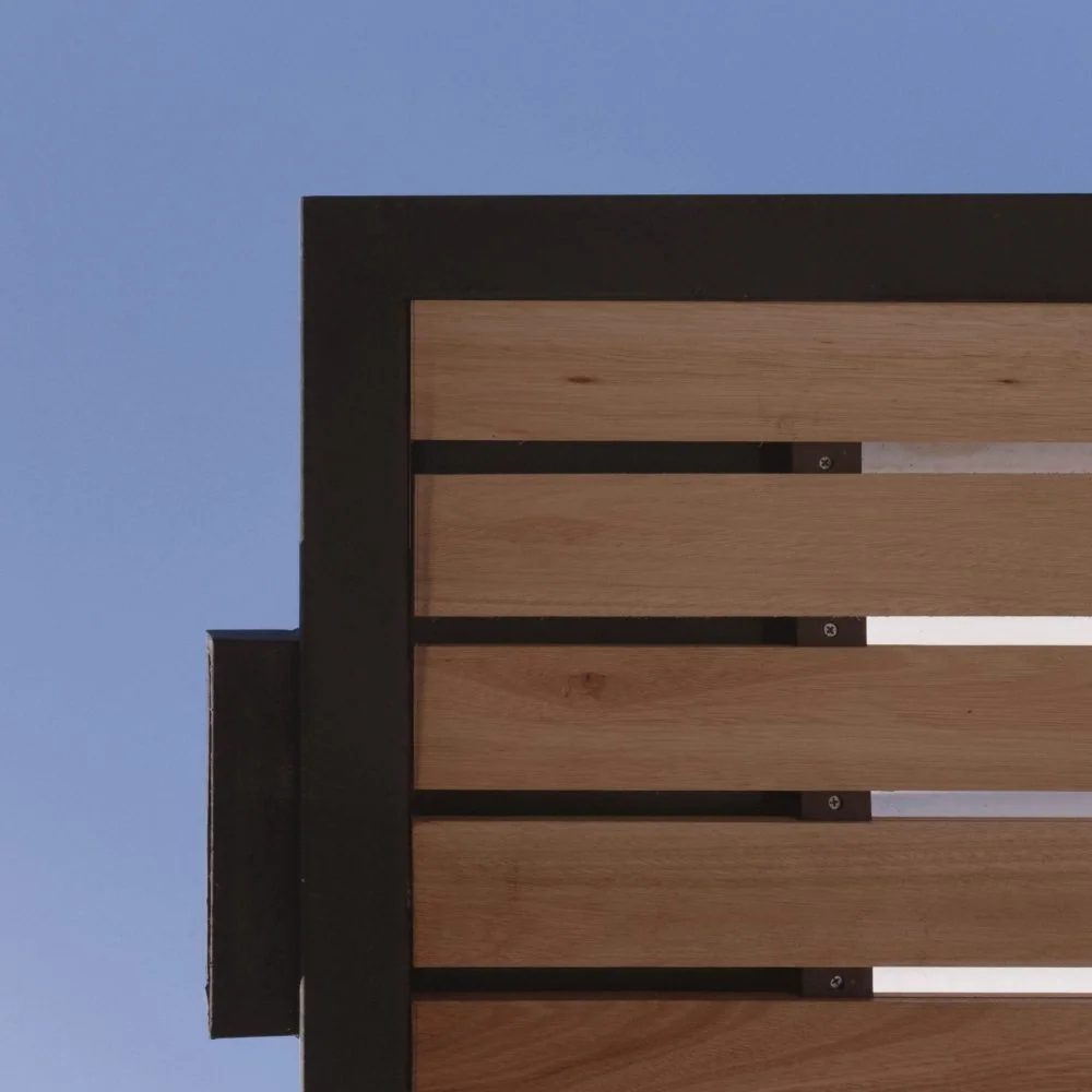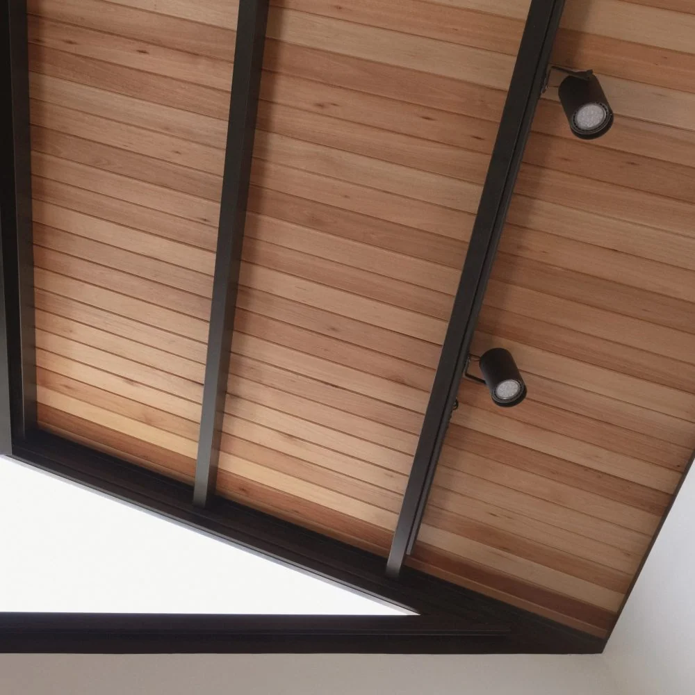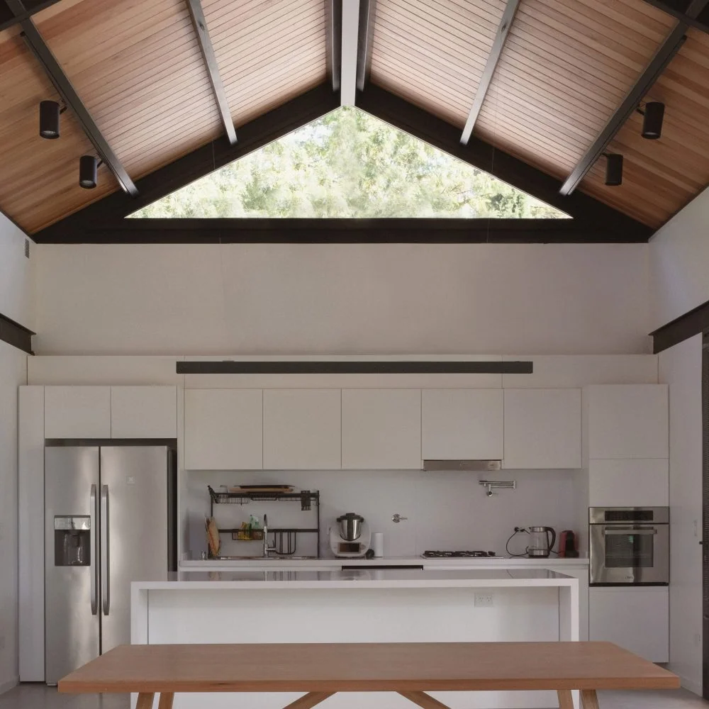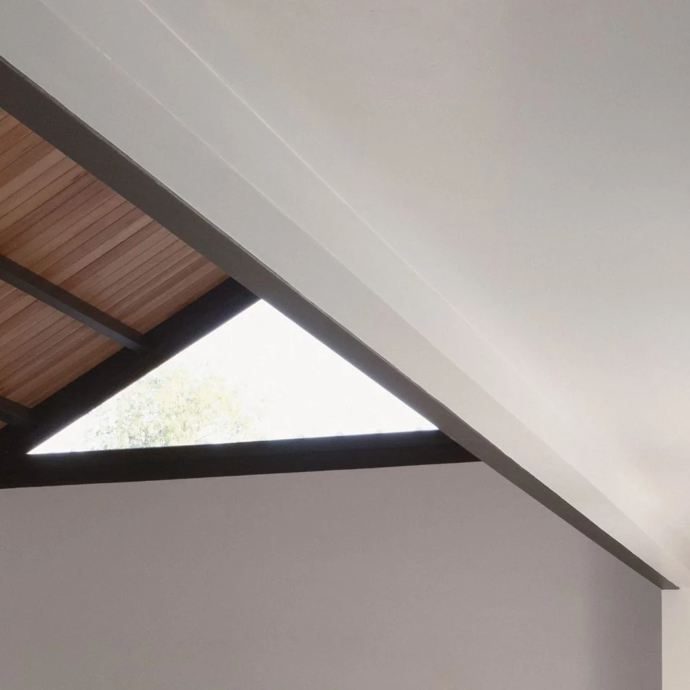 Una de las premisas fundamentales en el diseño de esta casa fue cumplir con las características propias del lugar. En particular, se requería que al menos el cincuenta y cinco por ciento de la superficie techada tuviera una inclinación no menor a treinta grados. Para cumplir con esta premisa, se diseñaron techos a dos aguas que adquieren protagonismo gracias a una estructura metálica sintética expuesta, en contraste con tablones de Eucaliptus Grandis. Estos techos a dos aguas, ubicados en el bloque central y el área privada de la pareja, no solo jerarquizan los espacios más importantes de la casa, sino que también brindan equilibrio volumétrico al conjunto arquitectónico.