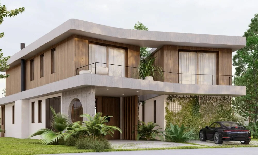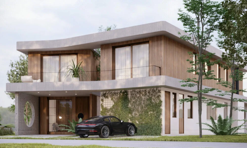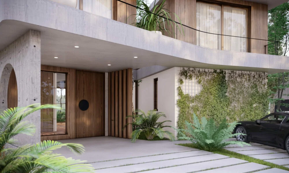 La fachada principal, con líneas curvas y vegetación integrada, refuerza el carácter orgánico del proyecto, mientras que las grandes superficies vidriadas de la fachada posterior conectan la casa directamente con el paisaje, permitiendo que el interior fluya sin interrupciones hacia el exterior.