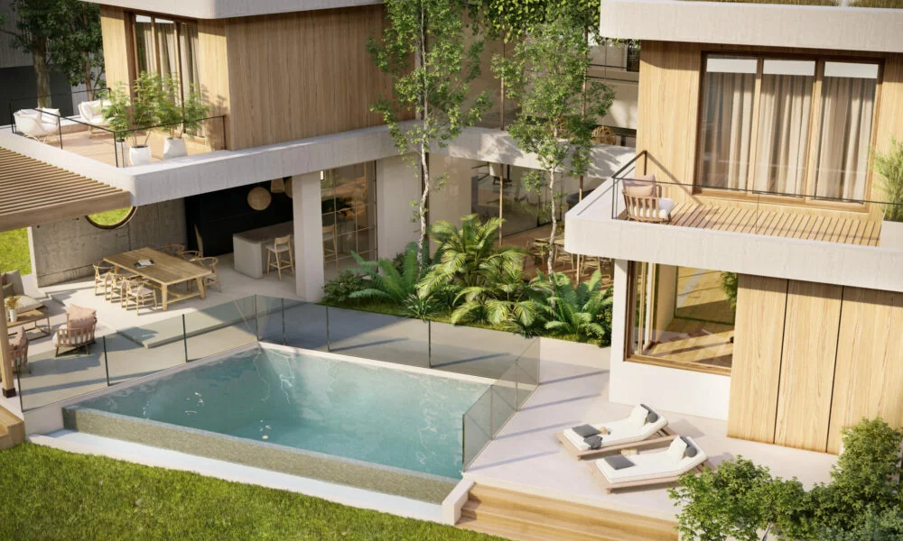 El nivel superior se destina a las áreas privadas. La nave sur acoge el dormitorio principal, con una terraza privada que ofrece vistas panorámicas al entorno. En la otra nave, se encuentran los dormitorios de los niños y un playroom, todos diseñados con balcones independientes que permiten momentos de relajación al aire libre.